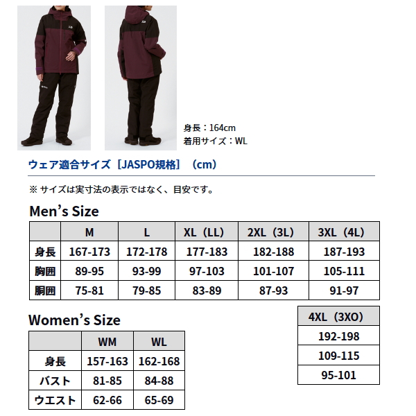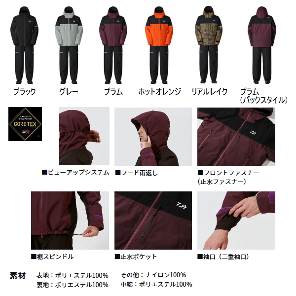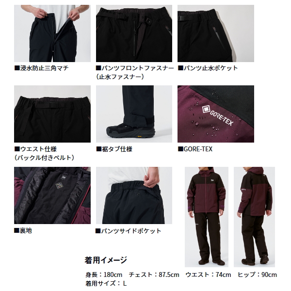 袖口からの浸水を軽減するカフスを内袖に搭載し、衣服内の濡れを最小限に抑える。パンツはバックル付き調整ベルトが搭載され、ずり下がりにくい仕様。
