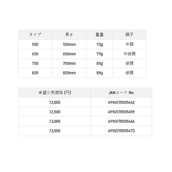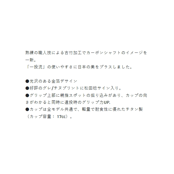 硬調:立った姿勢でのマキエ打ちができ、粘りのあるマキエに対応。グレ/チヌの遠投用。