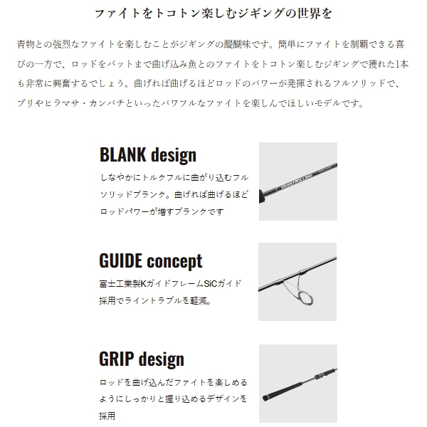 中型青物やサワラをターゲットに開発された、フルソリッドブランク採用のジギングロッド。