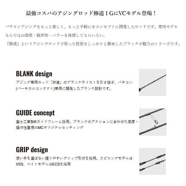 鰺道バチコンシリーズのベーシックモデル。ボトムで鰺の吸い込むアタリをしっかりと手元に伝えてくれる感度・デカアジもしっかりと寄せてくれるロッドパワーが魅力です。バチコンをこれから始める人にもオススメのモデルです。