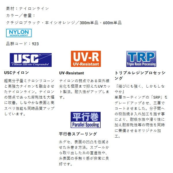 ●超高分子量シリコーンを融合させたUSCナイロンを採用。耐摩耗性能と遠投の飛距離が格段にアップします。(特第4673598号)