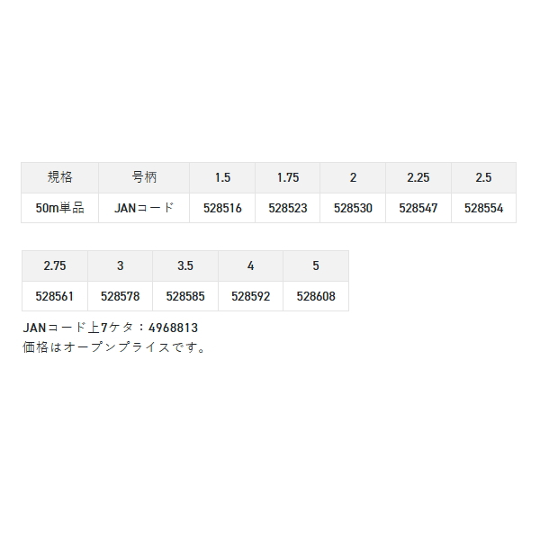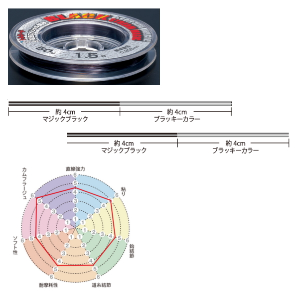 ◆浅ダナのスレた尾長グレを喰わせるためのカムフラージュ効果の高いハリスとして、その地位を築き上げた「ブラックストリーム」。しかし近年、日々賢くなる尾長グレ。もはや狙って釣るのは不可能とまで思われている巨大尾長グレに対応すべく、それはさらなる進化を遂げた。黒潮にはカムフラージュ効果があるとされているブラッキーカラーであるが、新たに色を細かい間隔で配色し、「線」ではなく「点」に見せることで、魚には繋がっていないハリス(点で存在する浮遊物)と錯覚させて、マジック効果をさらに高めた。