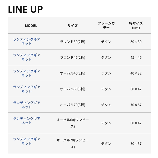 ・OVALフレーム(楕円)はOVAL40シリーズが「粗目、釜型、深さ30cm」の小型ネット付き。OVAL60/70シリーズが「粗目、釜型、深さ50cm」の大型ネット付き。