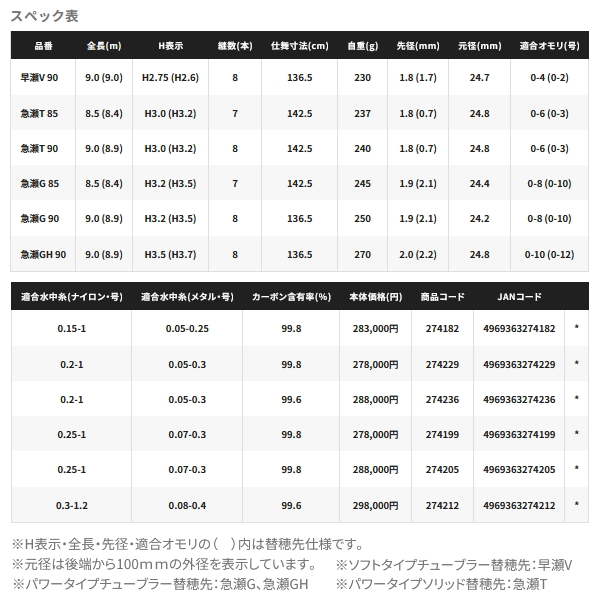 ◆6代目スペシャルトリプルフォース。大鮎&瀬釣りで入れ掛かりをもたらすロッドとして、パワーだけでなく軽さや操作性のバランスも徹底重視。さらに数々のテストと釣果から導き出された専用設計を施し、各アイテムの特性がさらに磨きがかかる。