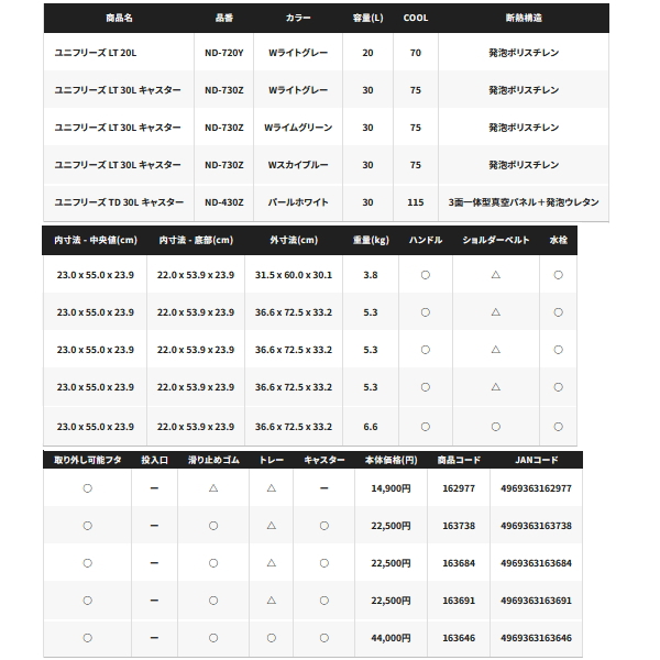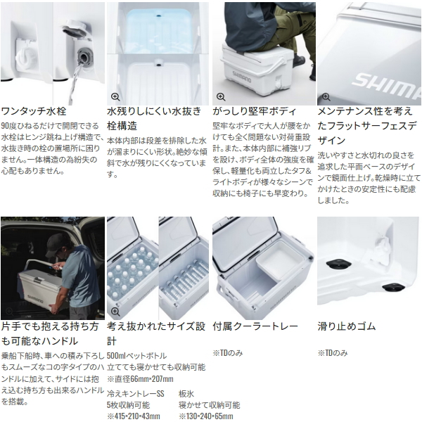 ※クーラーの寸法は目安です。※外寸法にはハンドルを含みます。※底部の長さは、底面の角Rの中心と中心を結んだ長さです。※各シリーズの収納例は、板氷:130×240×65mm、保冷剤XL:195×255×35mm、オキアミ:170×300×60mm、飲物:PETボトル500ml Φ66×207mm、PETボトル2l 90×105×305mm、PETボトル1l 75×95×205mmを想定しています。※上蓋の断熱材は全て発泡ポリスチレンです。※クーラーの蓋の裏にある小さな穴は、内部の圧力を調整するための通気孔です。ご安心してお使いください。※蓋は防水構造ではありません。合わせ目に水をかけないでください。※水栓のナットが内側に部分的に突出しているところがあります。※△はオプションで取り付けができます。