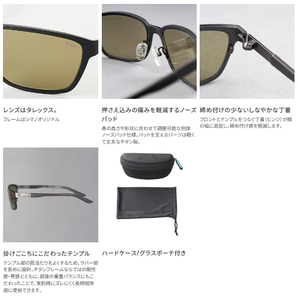 ◆シマノとタレックス社のコラボにより生まれた、偏光グラスのフラッグシップモデルSTL-101。タレックス社製レンズを標準装備しているだけでなく、別体ノーズパッド、チタンバネヒンジ、オールチタンフレームを採用し、質感、剛性感、見やすさ、かけごこちの良さを徹底追及しました。 ベーシックなスクエア形状で、あらゆるフィッシングスタイルにマッチします。