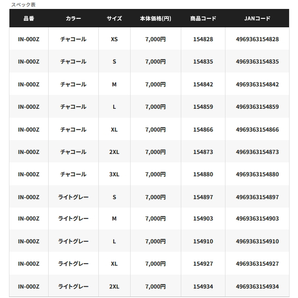 (26年3月新商品) シマノ ハイブリッドインナー シャツ IN-000Z チャコール XSサイズ (3月発売予定/ご予約受付中)