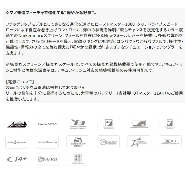 ◆フラッグシップモデルとしてさらなる進化を遂げたビーストマスター1000。タッチドライブスピードロックによる自在な巻き上げコントロール、海中の状況を鮮明に映しチャンスを視覚化するカラー液晶でのTankenmaruスクリーン、フォールを自在に操るNewフォールレバーを搭載し、多彩な戦略を可能にします。さらにEJモードを備え、電動ジギングにも対応。コンパクトながらパワフルで、操作性・機能性・情報力の全てを兼ね備えた「軽やかな野獣」が、さまざまなシチュエーションでアングラーを支えます。