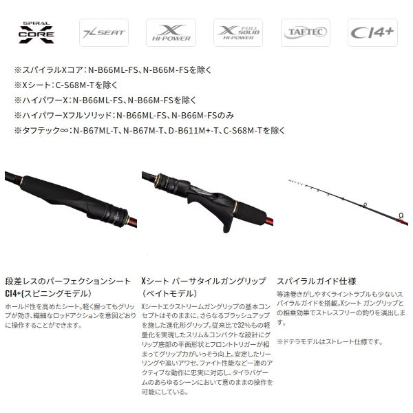 ◆数ある鯛ラバゲームの本質を追求し、乗せ調子(フルソリッド/ソリッドティップ/チューブラーティップ)、ドテラ調子、キャスティングの3シリーズ、計5タイプをラインナップ。タイプごとの特徴を活かした専用設計は、軽くて強いブランクスを実現するスパイラルXコア、フルソリッドをカーボンテープでX状に強化してブレやパワーロスを抑制したハイパワーXフルソリッド、高強度ソリッドタフテック∞などを適材適所に採用。ベイトロッドには優れたグリップ力を追求したXシートバーサタイルガングリップを採用。スリムでグリップ底部の平坦面とフロントトリガー効果により、グリップ力が向上し、安定したリーリングや追いアワセ、ファイト性能などアクティブな動作に対応。あらゆる実釣シーンにおいて意のままの操作が可能です。