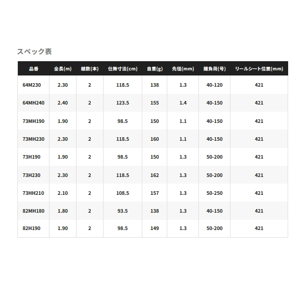 シリーズ随一の高負荷オモリの使用に耐えるパワーアイテム。2.1mの全長設計は高負荷オモリを手持ちで扱う操作性とクッション性を発揮します。アカムツ・クロムツ・オニカサゴ・ライトキンメといった中深場の釣りや、ライト泳がせなど高負荷の釣りで重宝する1本です。