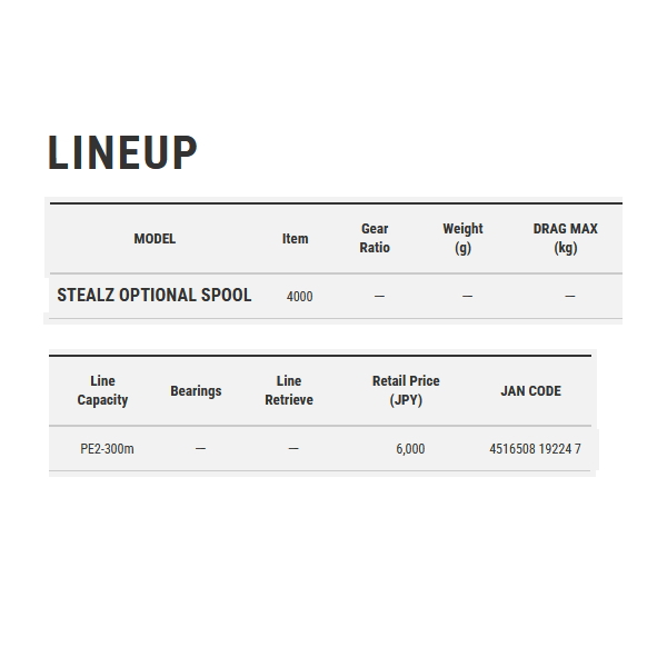 ◆STEALZの各番手に対応するオプショナルスプール。船上でクイックにラインの太さを変えたい時に重宝する。また、不意なライントラブルに見舞われても、即座に付け替えてチャンスを逃さずゲームを展開することが可能。