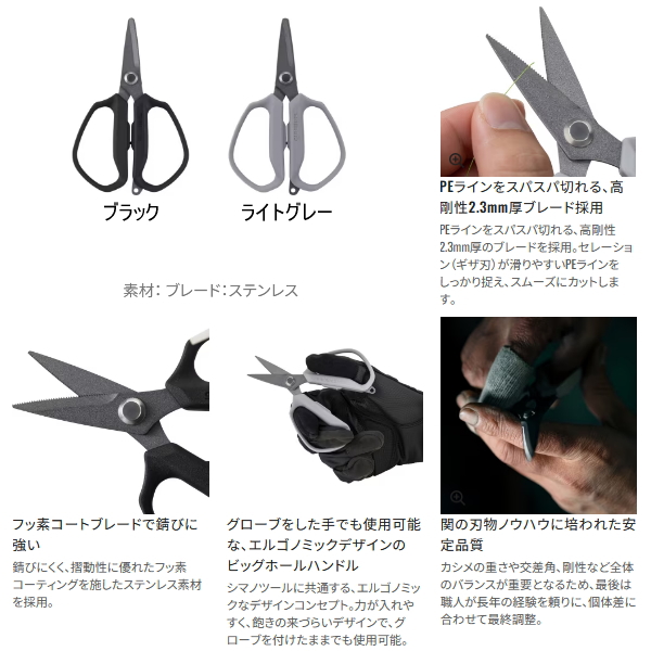 世界的な刃物の産地・岐阜県関市の職人が一つひとつ手作業で仕上げた小型バサミスパシザーの「先鋭」タイプ。PEラインに特化したカット性能はそのままに、より握りやすいデザインになりました。切りにくいPEラインも、テンションをかけずにスムーズにカットでき、グローブを付けたままでも使用できます。