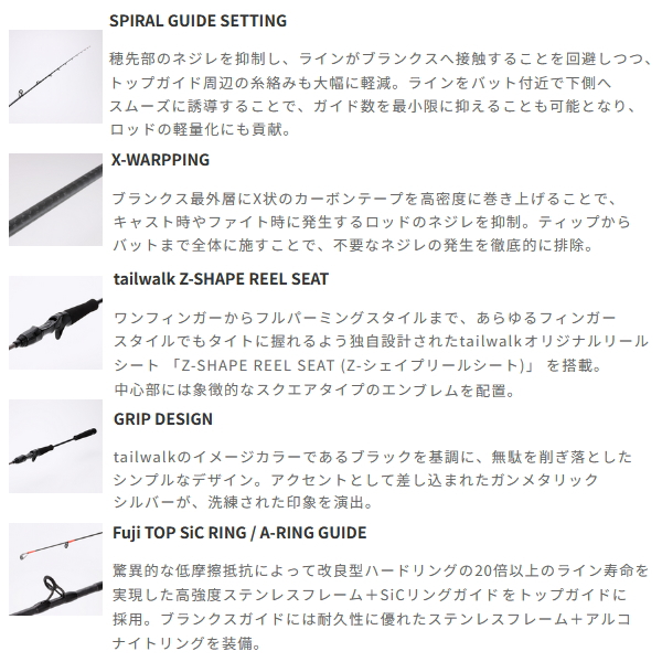 バーチカルからドテラ流しまで幅広く対応し、最大200gまでのタイラバに対応可能な汎用性の高いライトクラス。マダイのバイトを確実に絡め取り、掛けた後の激しい突っ込みにもフレキシブルに追従する、粘り強い中弾性カーボンプリプレグを0°方向中心に巻き上げたブランクスを採用。