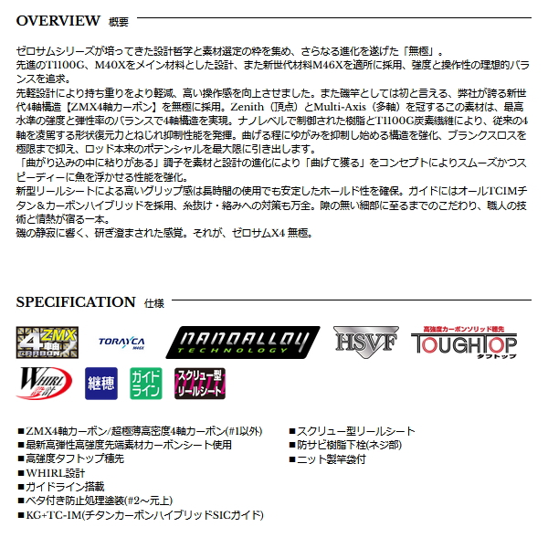 先軽設計により持ち重りをより軽減、高い操作感を向上させました。また磯竿としては初と言える、弊社が誇る新世代4軸構造【ZMX4軸カーボン】を無極に採用。Zenith(頂点)とMulti-Axis(多軸)を冠するこの素材は、最高水準の強度と弾性率のバランスで4軸構造を実現。ナノレベルで制御された樹脂とT1100G炭素繊維により、従来の4軸を凌駕する形状復元力とねじれ抑制性能を発揮。曲げる程にゆがみを抑制し始める構造を強化、ブランクスロスを極限まで抑え、ロッド本来のポテンシャルを最大限に引き出します。