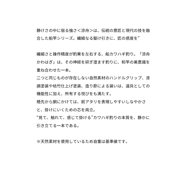繊細さと操作精度が釣果を左右する、船カワハギ釣り。「涼舟 かわはぎ」は、その神経を研ぎ澄ます釣りに、和竿の美意識を重ね合わせた一本。