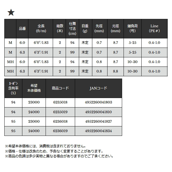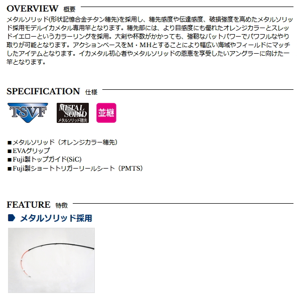 メタルソリッド(形状記憶合金チタン穂先)を採用し、穂先感度や伝達感度、破損強度を高めたメタルソリッド採用モデルイカメタル専用竿となります。穂先部には、より目感度にも優れたオレンジカラーとスレッドイエローというカラーリングを採用。大剣や杯数がかかっても、強靭なバットパワーでパワフルなやり取りが可能となります。アクションベースをM・MHとすることにより幅広い海域やフィールドにマッチしたアイテムとなります。イカメタル初心者やメタルソリッドの恩恵を享受したいアングラーに向けた一竿となります。