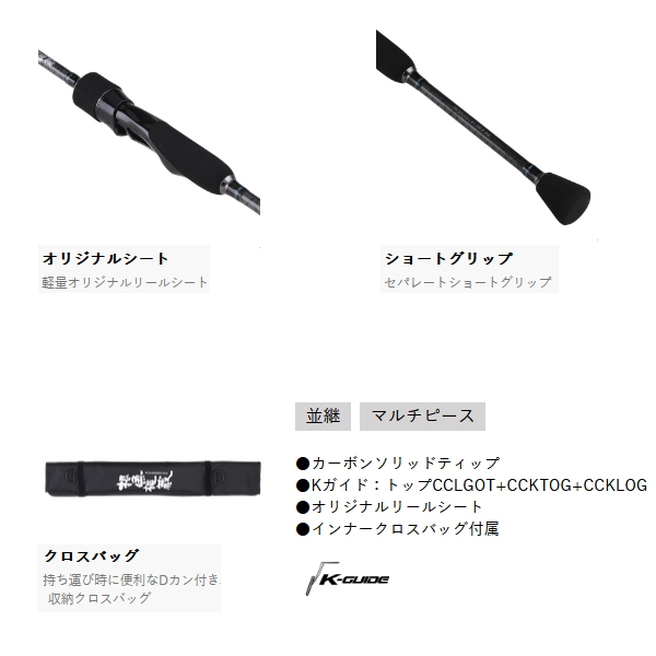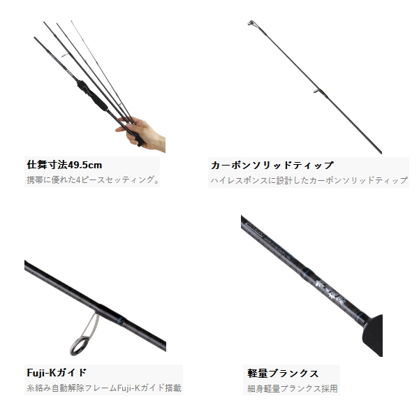 超軽量ジグヘッドなども軽快に操りショートバイトにも追従し鋭く掛けるカーボンソリッドティップ。